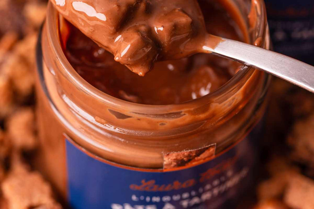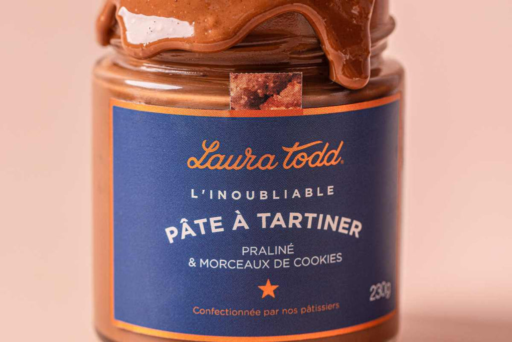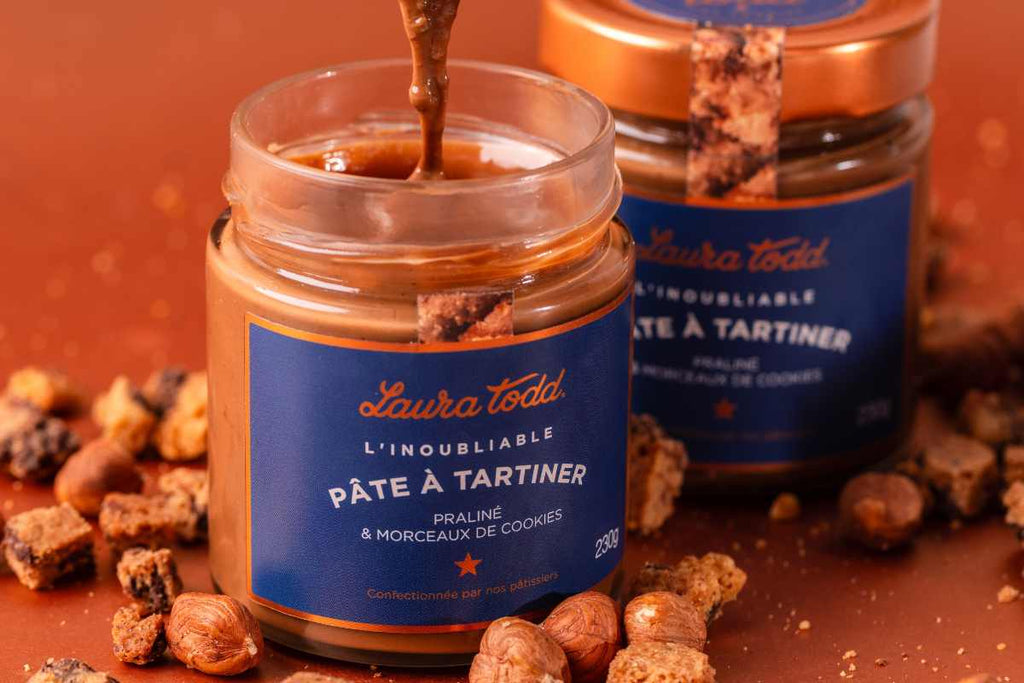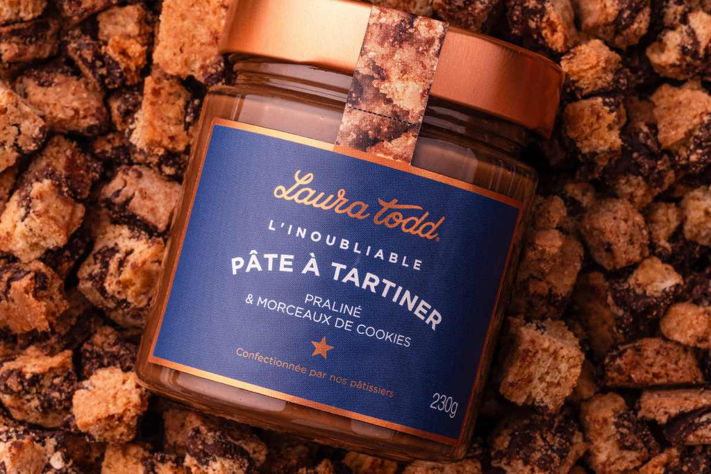 The unforgettable Laura Todd Spread is made with our signature milk chocolate (sustainably sourced cocoa), into which we pour a smooth hazelnut and almond praline . What makes it truly unique? We add generous chunks of toasted cookies for a delightful textural contrast . very very gourmand.